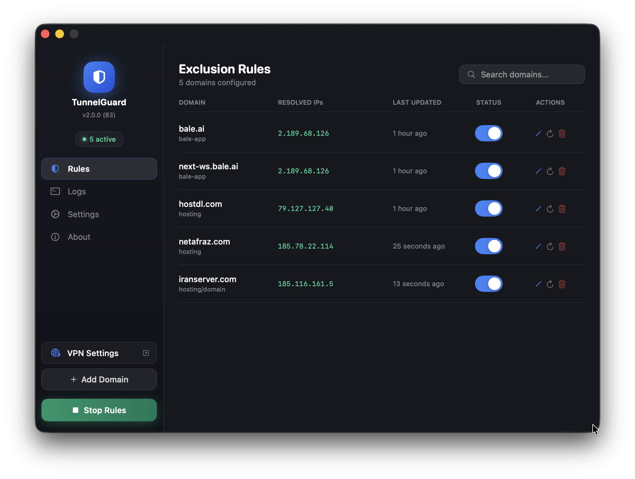 - Click “Add Rule” — TunnelGuard resolves the domain’s IPs